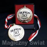 Złoty medal 50 Latek. Medal wykonany jest z odlewanego stopu metalu imitującego złoto. Prezentuje się świetnie i solidnie. Medal posiada bia...