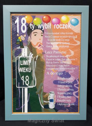 Ramka z życzeniami na 18-ste urodziny. Wysokość: 28cm, szerokość: 22cm